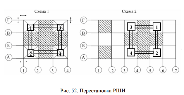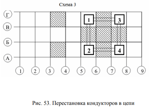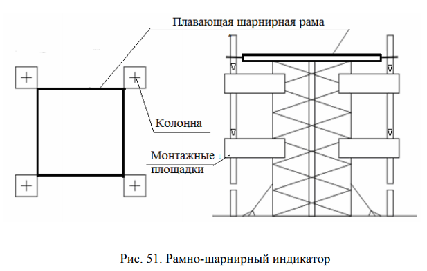 Комплект монтажного оснащения РШИ содержит не менее четырёх групповых кондукторов, скреплённых поверху системой горизонтальных связей. Каждый кондуктор в комплекте имеет свой порядковый номер, определяющий его положение в цепи. Установка кондукторов на здании и перестановка их с одной позиции на другую производится краном, занятым на монтаже здания, в строго определённом порядке, указанном в ППР (рис. 52). После перестановки на следующую стоянку кондукторов № 1 и № 2 кондукторы № 3 и № 4 остаются на месте, для того чтобы не разорвать монтажно-контактную цепь. При установке шарнирных рам комплекта кондукторов в проектное положение необходимо соблюдать следующие правила: 1) базы кондукторов устанавливают на перекрытие относительно установочных рисок с погрешностью не более 100 мм;