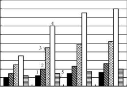 Рис. 2. Прочность микроструктурных связей ОММ со ставов (мас. %): 1 - песок 50, шлам ПАЗ 50, гудрон 10 (коагуляционная связь); 2 - после экстрагирования гудрона из ОММ оптимального состава с добавками (конденсационно-кристаллизационная связь); 3 - ОММ оптимального состава (коагуляционная и конденсаци- онно-кристаллизационная связи); 4 - песок 50, шлам ПАЗ 50, добавка Щ 3, добавка СС 0,1, вода 7,5 (кон- денсационно-кристаллизационная связь); 5 - песок 50, шлам ПАЗ 50, вода 7,5 (конденсационнокристаллизационная связь)