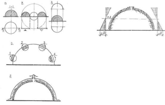Рис. 1. Традиционные утепленные тонкостенные оболочки с геометрической формой: а - полусфера; б - полутор (замкнутый или разомкнутый); в - ци¬ линдрического свода со сферическими торцами; г - характер утепления: 1 - с наружной стороны; 2 - с внутренней стороны; 3 - одно- и многослойными воздушными прослойками; 4 - с внутренней стороны на относе; д - продольное проветривание воздуш¬ ной прослойки