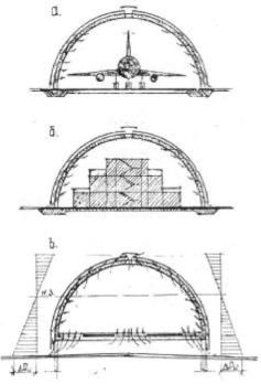 Новые ограждающие конструкции с авто¬ номно - управляемой фильтрацией воздуха позволяет разрабатывать особо эффективные по энергосбережению, универсальные и мно¬ гофункциональные здания и сооружения (рис. 3). Представляет интерес производственное здание с общей плоской фундаментной плитой под всем объёмом и утеплением её по пери¬ метру (рис. 3.а). Производственное здание с многоэтажной этажеркой (рис. 3.б) и здание многофункциональное с проветриваемым под¬ польем и воздухопроницаемым покрытием для особых условий вечномёрзлых оснований (рис 3.в).