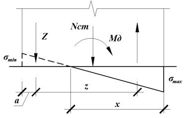Минимальные нормальные напряжения (кгс/см2) на поверхности фундамента при наибольшем изгибающем моменте, полученном от действия постоянных и временных нагрузок, необходимо определить по формуле