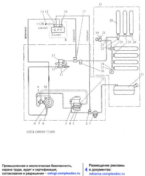 На рис. 7.8 приведена комбинированная принципиальная и монтажная схема газобаллонной аппаратуры «НЗГА» для грузовых автомобилей.