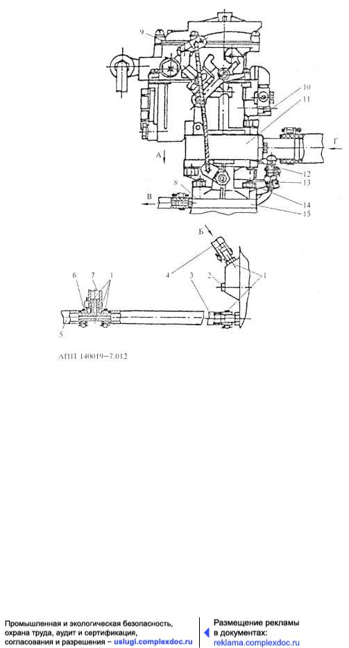 1 - хомуты; 2 - винт холостого хода; 3 - вакуумный ниппель проставки холостого хода; 4 - шланг; 5,7 - вакуумные рукава; 6 - вакуумный тройник; 8 - прокладка проставки холостого хода; 9 - удлиненная тяга; 10 - болт М6×40; 11 - смеситель газа; 12 - прокладка; 13 - шпилька; 14 - прокладка; 15 - проставка холостого хода