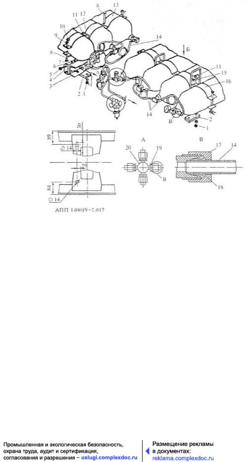 1 - гайка Ml2×1,25; 2 - накладка стремянки; 3 -- поперечина рамы; 4 - кронштейн поперечины; 5-7 -болт, гайка, шайба; 8-10 - болт, гайка, шайба; 11 - усилитель; 12 - стремянка; 13 - трехволновые кронштейны; 14 - газовый трубопровод высокого давления; 15 - стремянка; 16 - четырехволновый кронштейн; 17 - накидная гайка; 18 - ниппельное кольцо; 19 - штуцер крестовины; 20 - крестовина