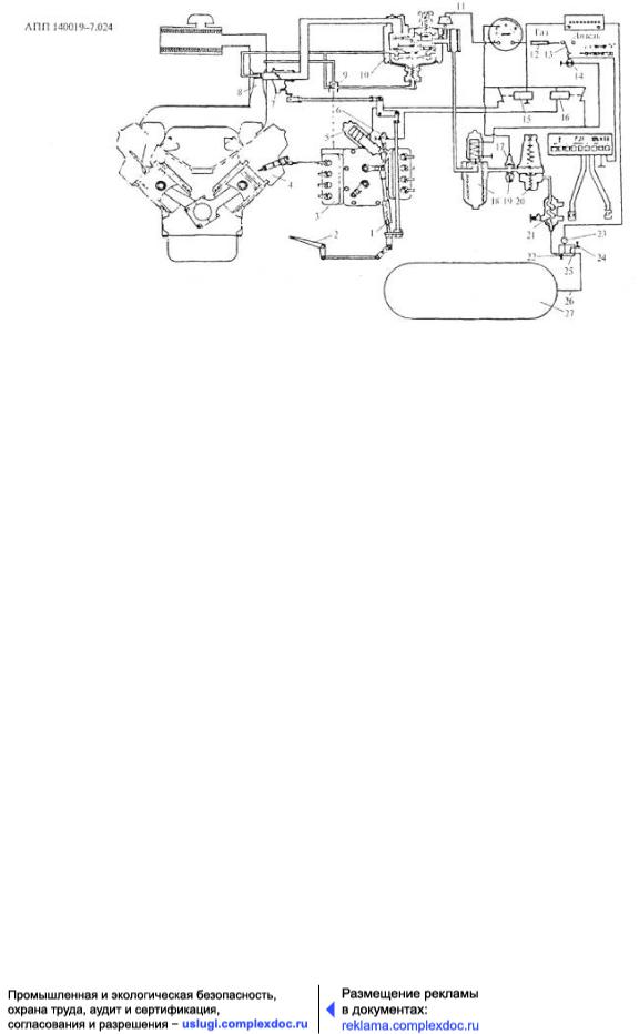 1 - тяга привода регулятора и дозатора газа; 2 - педаль подачи топлива; 3 - ТНВД; 4 - двигатель; 5 - механизм установки запальной дозы топлива;6 - выключатель блокировки; 7 - дозатор газа; 8 - смеситель газа; 9 - пневмомеханический датчик; 10 - ЗРД; 11 - датчик давления газа; 12 - предохранитель; 13 - клавиша переключения «газ-дизель»; 14 - контрольная лампа; 15 - реле электромагнита установки запальной дозы; 16 - реле электроклапана газового фильтра; 17 - датчик аварийного падения давления газа; 18 - ЭМК; 19 - предохранительный клапан; 20 - РВД; 21 - подогреватель; 22 - магистральный расходный вентиль; 23 - датчик давления газа; 24 - наполнительный вентиль; 25 - крестовина; 26 - трубопровод высокого давления; 27 - баллон