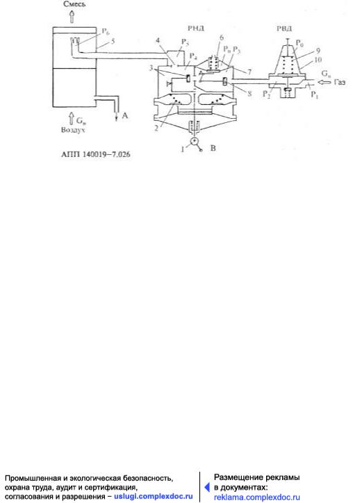 1 - кулисный механизм; 2 -- пружина разгрузочного устройства; 3 - полость второй ступени с клапаном; 4 - дроссельная шайба; 5 - смеситель; 6 - пружина; 7 - мембрана первой ступени; 8 - клапан первой ступени; 9 - пружина; 10 - корпус РВД; А - к индикатору засоренности воздушного фильтра; В - к приводу ТНВД