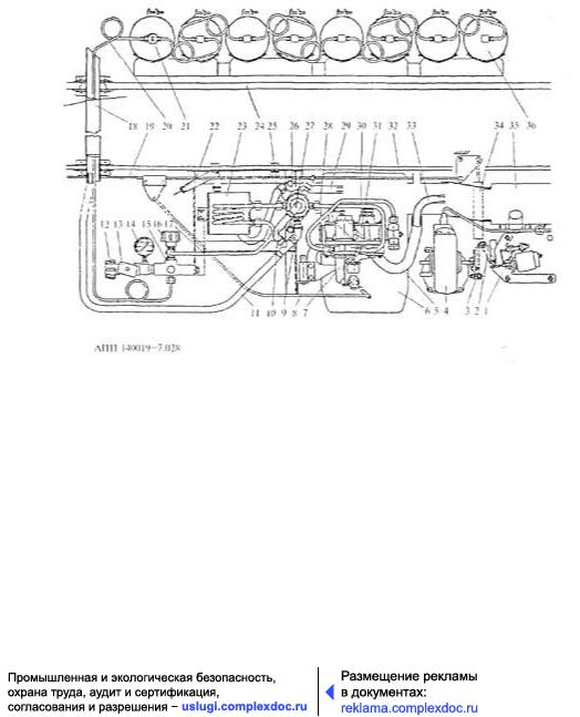 1 - электропроводка; 2 - щиток; 3 - кассета из восьми баллонов; 4 - защитная трубка в салоне; 5 - РВД; 6 - смеситель газа; 7 - механизм установки запальной дозы; 8 - ТНВД; 9 - РНД; 10 - тяга привода подачи газа; 11 - газовый ЭМК; 12 - подогреватель газа