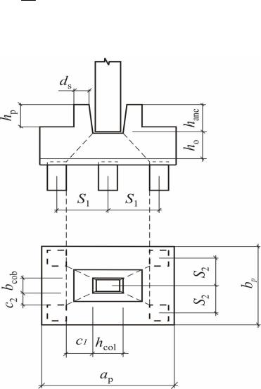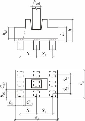 до параллельной ей плоскости, проходящей по внутренней грани ближайшего ряда свай, расположенных за пределами нижнего основания пирамиды продавливания, м; с2 – расстояние от грани колонны с размером hcol до параллельной ей плоскости, проходящей по внутренней грани ближайшего ряда свай, расположенных за пределами нижнего основания пирамиды продавливания, м.