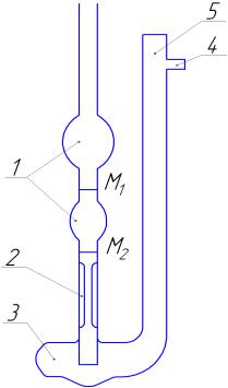 Вискозиметр представляет собой U-образную трубку, над капилляром 2 которого имеются две шарообразные калиброванные емкости 1, между которыми нанесена первая метка М1 (кольцо). Выше капил-