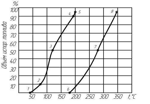 определяющие пусковые качества бензина и ДТ; 3 – температура, определяющая среднюю (рабочую) испаряемость бензина (t50%); 4 и 8 – температура, характеризующая наличие в топливе тяжелых фракций и смол; 5 и 8 – конец разгонки