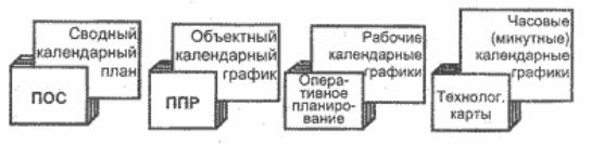 Разделяют четыре вида календарных графиков, в зависимости от широты решаемых задач и вида документации, куда они входят. Все виды календарных графиков должны быть тесно увязаны друг с другом.