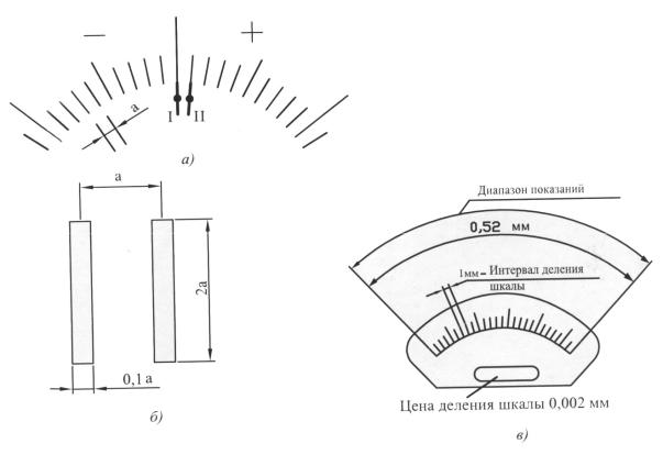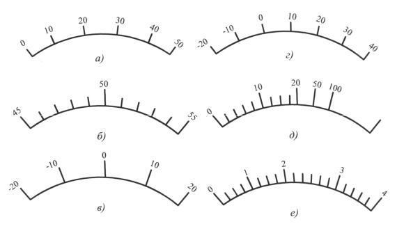 –длине шкалы, если она существенно неравномерна (рис.4.2, д.). В этом случае, поскольку длина выражается в миллиметрах, то абсолютная погрешность выражается также в миллиметрах.