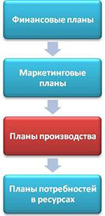 В свою очередь, производственные планы определяют требования к закупочной политике предприятия, к политике управления человеческими ресурсами ресурсами инфраструктуры (оборудование, электроэнергия, коммуникации и т.д.), в результате чего на основании планов производства формируются планы потребностей в ресурсах: планы закупок сырья и материалов, планы управления производственными мощностями, планы найма и ротации производственного