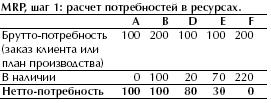 На первом этапе делается расчет нетто-потребностей в материалах на основании данных о составе изделия (спецификации). Число необходимых материалов, узлов компонентов оценивается с учетом имеющегося в наличии или в незавершенном производстве.