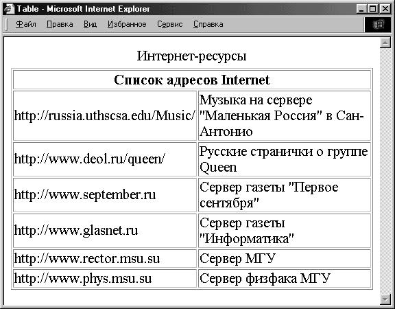 <TH COLSPAN="2">Список адресов Internet</TH> </TR>