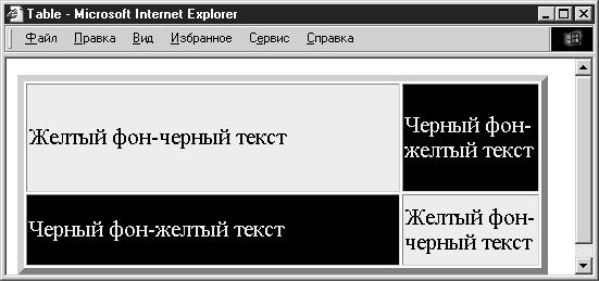 <TD BGCOLOR="BLACK" WIDTH="122" HEIGHT="100"> <FONT COLOR="YELLOW">Черный фон-желтый текст</FONT> </TD>