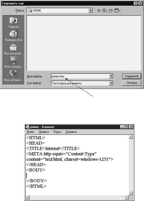 Рис. 5. Сохранение файла с именем primer.htm в папку HOME