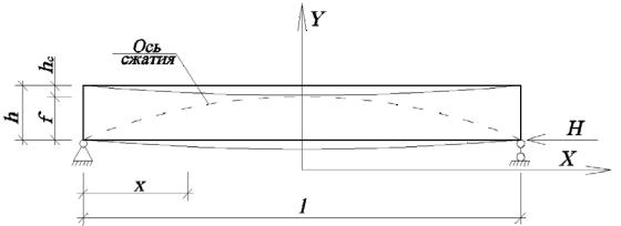 Моменты M1 от единичного неизвестного H1 = 1 определяем относительно криволинейной оси, соответствующей линии главных сжимающих напряжений и имеющей форму арки (далее ось сжатия). При равномерно распределенной вдоль пролета нагрузке q очертание оси примем по квадратной параболе со стрелой подъема w0 = h − f − h0 / 2. Здесь h – высота балки; hc – высота сжатой зоны (в