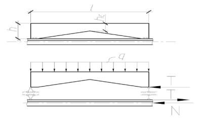 Верхняя часть модел рует торцевое ребро, загруженное сверху равномерно распределённой погонной нагрузкой q и приложенным в одном опорном узле сдвигающим (распорным) усилием взаимодействия T. Торцевое ребро длиной l = 150 см (ширина типовой плиты покрытия) имеет переменное сечение: высота на опорах равна высоте продольных рёбер h = 30 см и высота посередине длины hс = 15 см. Средняя ширина (толщина) ребра b = 20 см.
