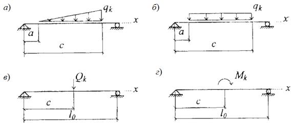 Точные значения коэффициентов qkn, tkn, wkn и ϕkn определяются из зависимостей, аналогичных (8.2). Для некоторых схем загружения k-ой плиты, показанных на рис. 8.2 (а, б, в, г), получены более простые выражения: