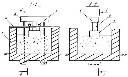 Нагрузка на штамп создается установленным на нем (в центре) гидравлическим домкратомА. Значения нагрузки определяются показанием манометра, имеющегося на домкрате. Реактивное усилие от домкрата воспринимается анкерной балкой и через две анкерные тяги передается днищу лотка, в котором концы тяг надежно заделаны. Штамп и домкрат размещаются Дв середине пролета анкерной балки по центру ее опорной плиты (по вертикальной оси лотка).