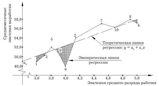 отклонений от которой точек корреляционного поля равна нулю (на рис. 7 – пунктирная линия, именуемая теоретической линией регрессии), или, другими словами, – линией, заштрихованные и незаштрихованные площади между которой и эмпирической линией регрессии, равны.