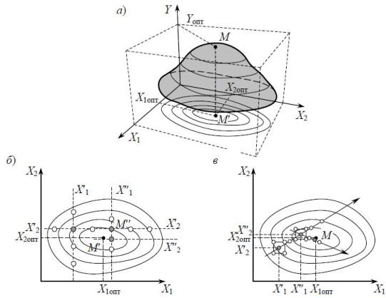Рис. 18. Графическое представление функции отклика (а); поиск оптимума классическим методом (б) и методом «кругового восхождения» (в)