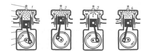 В двигателе внутреннего сгорания топливо поступает в цилиндры в смеси с воздухом. Эта горючая смесь приготовляется в карбюраторе. В цилиндре двигателя горючая смесь сжимается, а затем воспламеняется электрической искрой. При сгорании выделяется тепло и образуются газообразные продукты сгорания. Они давят на стенки цилиндра и поршень, заставляя его опускаться внутри цилиндра. Поршень связан шатуном с коленчатым валом. С помощью шатуна возвратно-поступательное движение поршня преобразуется во вращательное движение коленчатого вала двигателя. При вращении коленчатого вала поршень движется попеременно вверх и вниз. Каждому ходу поршня соответствует поворот коленчатого вала на один полуоборот (180 градусов).