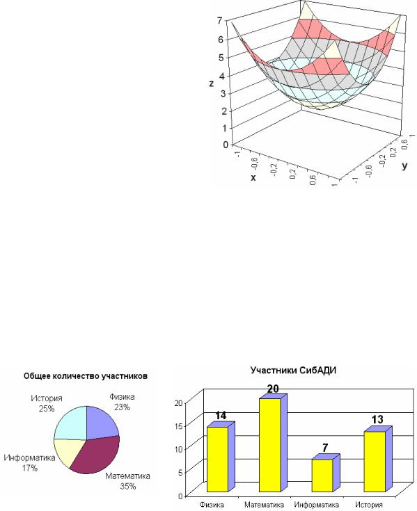 Задание 3. Построить поверхность z=ax2+by2+c при x [–1;1], y [–1;1], шаг 0,2; a, b, c – произвольные коэффициенты, записанные в отдельные ячейки рабочего листа. При вычислении значений z формулу ввести один раз и скопировать ее с помощью маркера заполнения (использовать абсолютную и смешанную адресацию).