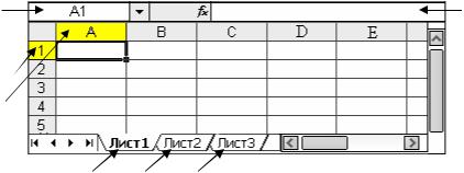 Над электронной таблицей расположена строка формул для ввода и редактирования данных. Слева от строки формул находится поле имени, в котором отображается имя выделенной ячейки.
