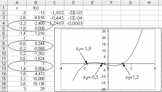Полученные после уточнения корней значения функции f(x) могут быть записаны в экспоненциальной форме, например, в ячейке D2 получилось число –2E–05. Это означает –2 10–5, т.е. –0,00002. Учитывая относительную погрешность 0,001, можно сказать, что это ноль, следовательно, корень найден и он равен –1,802.