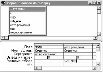 Условия отбора – это ограничения, которые пользователь накладывает на запрос для определения записей, с которыми он будет работать. Условие отбора записей вводится в строке Условие отбора в столбце, соответствующем полю, значение которого проверяется.