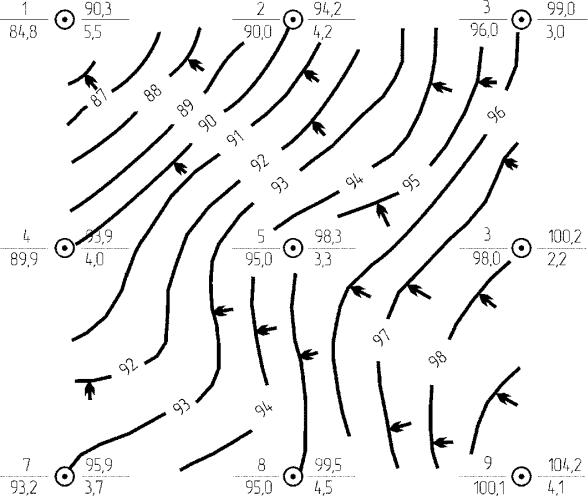 Слева от скважины показывают её номер – в числителе, а в знаменателе – абсолютную отметку уровня грунтовой воды. Справа от скважины в числителе записывают абсолютную отметку устья скважины, в знаменателе – глубину залегания уровня грунтовой воды в этой скважине. Затем путем интерполяции между абсолютными отметками уровня грунтовых вод находят точки с абсолютными отметками, равными целому числу. Интерполяцию выполняют для всех сторон четырех квадратов, составляющих сетку скважин. Интерполяцию можно выполнять арифметическим методом либо с помощью палетки.