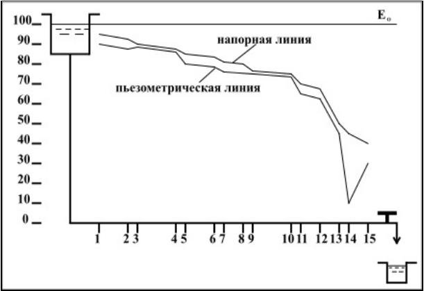 Рис. 5. Пример построения напорной и пьезометрической линий