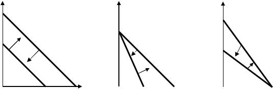 Изменение цены товара Х сместит бюджетную линию вдоль оси Х, не изменяя точки ее пересечения с осью У (рис. 8, б). Если цена товара Х упадет, то потребитель сможет приобрести большее количество этого товара, т.е. бюджетная линия повернется вправо и ее наклон станет более пологим. Если цена товара Х вырастет, то это повернет бюджетную линию к началу коорди-