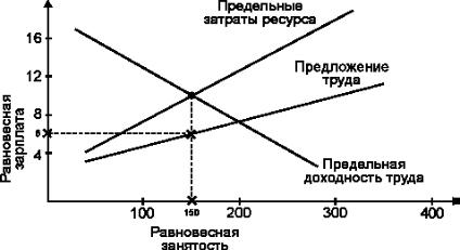 равновесная ставка заработной платы не определяется пересечением кривых предельных затрат и предельной доходности ресурса. Равновесная ставка заработной платы находится на кривой предложения под пересечением этих кривых.