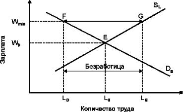 Без минимально установленного уровня заработной платы рынок труда неквалифицированной рабочей силы уравновешивается в точке Е при равновесном уровне зарплаты W0. При введении минимальной заработной платы Wmin предприятия стараются функционировать на уровне точки F кривой спроса, а работники желали бы достичь уровня точки G на кривой предложения. Тогда количество предлагаемого труда превышает спрос на величину FG, в результате чего появляется безработица в размере