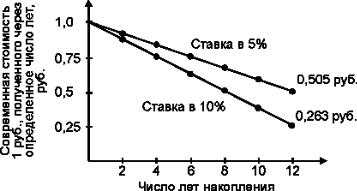 Если процентная ставка будет ниже 10 %, то фирма готова заплатить за автомобиль больше, чем 17640 рублей, и наоборот, если процентная ставка выше 10 %, то фирма готова платить меньше, чем 17640 руб. Почему так происходит? Ответ продемонстрируем на следующем примере. Для приобретения машины фирма берет займ под 10 % годовых. При данной ставке процента значительная часть поступлений фирмы отойдет банку и она не получит планируемый уровень прибыли, а если займ равен 5 % годовых, то фирма готова заплатить за автомобиль 19501 рубль.