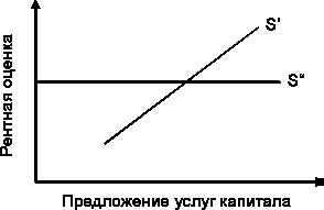 Кривая предложения S''' отражает альтернативное предложение, согласно которому предложение услуг капитала не является совершенно эластичным, так как капитал растет в цене по мере увеличения его предложения. Это означает, что кривая долгосрочного предложения для отраслей, производящих капитальные активы, будет возрастающей.