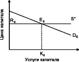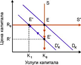 луг капитала в условиях краткосрочного равновесия не покрывает расходов по предоставлению этих услуг, то инвесторы, поставляющие капитал в отрасль, не видят смысла поддерживать основные фонды. В результате сокращения капитала растет его цена. Через определенный период времени точка равновесия смещается вверх вдоль кривой DK'. В точке E' устанавливается долгосрочное равновесие. В точке E'' поставщики услуг капиталов вновь получают минимально предельную рентную оценку капиталов.
