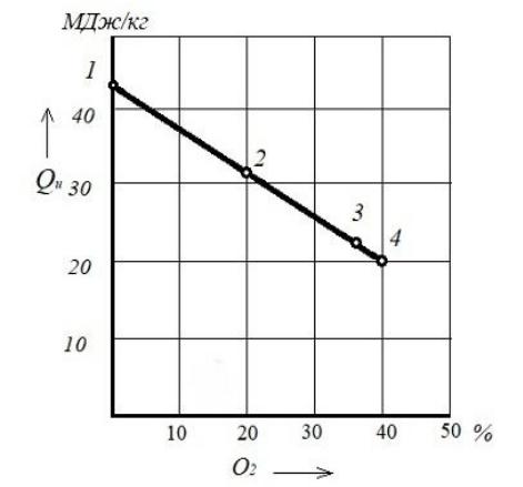 Рис. 7.2. Изменение теплотворной способности бензола С6Н6 (точка 1) в зависимости от степени окисления: