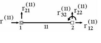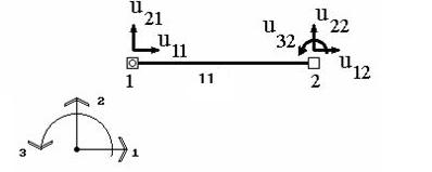 Например, для двухузлового элемента, имеющего в конечноэлементной схеме номер 11, характеризующегося тремя степенями свободы (рис. 4.2), вектор узловых перемещений будет иметь вид [9]