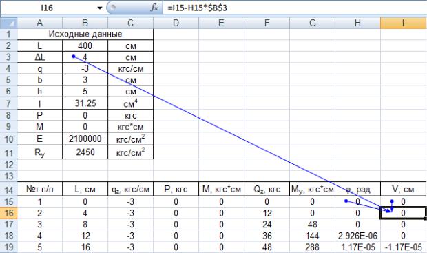 то вертикальное перемещение на опоре равно нулю V1=0, а также момент равен нулю My=0. Данные значения напрямую вводятся в первые ячейки вертикальных перемещений и изгибающего момента. Поперечная сила и угол поворота являются неизвестными параметрами. Таким образом, изменяемыми ячейками будут Qz1, φ1.