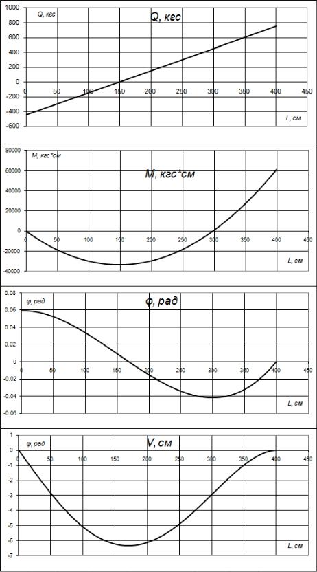 Рис.2.15. Эпюры поперечных сил Qz, изгибающего момента My, угла поворота φ, вертикальных перемещений V