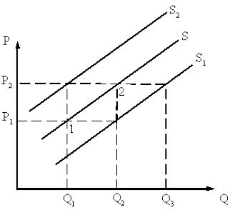 вара влияет на изменение предложения (функции предложения), что графически выражается смещением кривой S (см. рис. 5).То есть при той же цене P2 при снижении издержек производитель предложит больший объем Q3>Q2 (кривая S1), при увеличении издержек – меньший объем – Q1<Q2 (кривая S2).