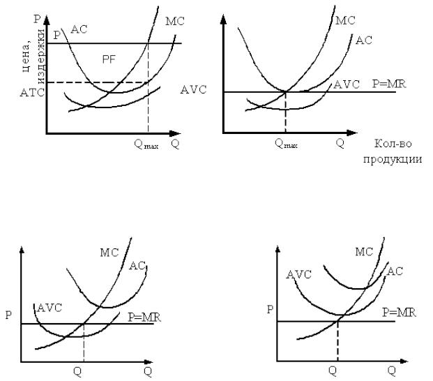 При опт мальном о ъеме производства, когда Qmax P = MC > AC, фирма будет получать экономическую прибыль: РF=(Р–АС) Qmax (рис. 20). При опт мальном о ъеме производства, когда МС=Р=АС, фирма получ т нулевую эконом ческую прибыль, т.е. работает в режиме самоокупаемости (р с. 21). Если Р=МС<АС, фирма несет убытки, но будет продолжать функц он ровать в краткосрочном периоде (минимизация убытков). Если Р=МС<AVCmin, то фирма покинет данный конкурентный рынок в поисках более выгодной сферы деятельности (рис. 22). В долгосрочном периоде максимум прибыли достигается фирмой при условии MR=MC=Р=АС (рис. 23); фирма получает нормальную прибыль нулевую экономическую, что связано со стабилизацией объема выпуска в отрасли.