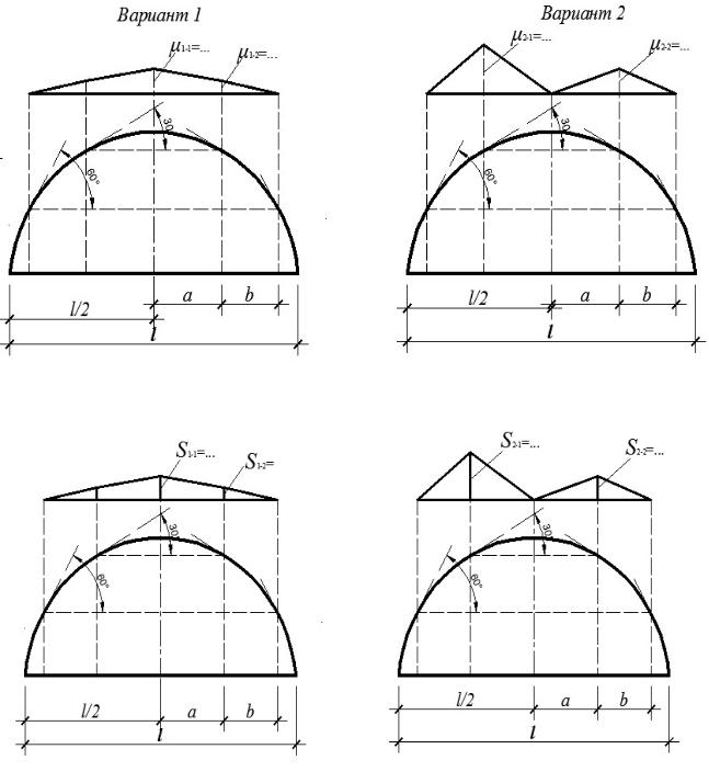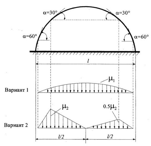 Схемы распределения снеговой нагрузки и значения коэффициента μ следует принимать в соответствии с приложением Г, п. Г.2.1, рисунок Г.2 [1], при этом промежуточные значения коэффициента μ определяются линейной интерполяцией. Расчет производится для двух вариантов загружения.