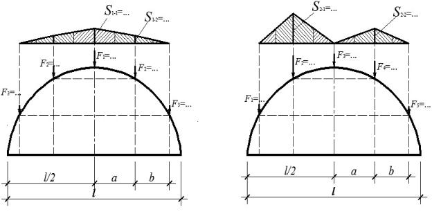 4. Для определения сосредоточенных сил F (кгс) в заданных точках покрытия определяется площадь эпюры S с учетом поперечной грузовой ширины и умножается на шаг несущих конструкций свода (рис. 11).