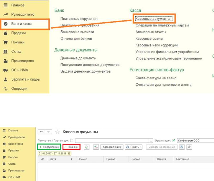 Выбираем пункты меню Банк и касса => Касса => Кассовые документы