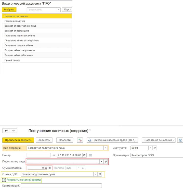 В 1С предлагается десять видов ПКО в зависимости от вводимой операции. Они следующие: